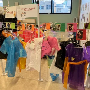 誰が作った作品かが分かるように、顔写真と一緒に掲示しています。また、作品名やポイントを書き添えることで、みんなにその魅力が伝わるよう工夫しています。作品が増えてきた場合はクローゼットのように収納することもありますが、一番お気に入りの衣装は正面から見えるように配置しています。