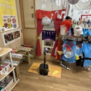ピアノへの興味をきっかけに、他の楽器や歌へと遊びが広がりました!スタンドマイクやステージを子どもたちと一緒に作ったことで、表現することをより楽しむ姿が見られるようになりました。最近ではオリジナルの衣装を身につけて、ノリノリで歌う姿も見られています♪共通点のあるアイテムを近くに配置することで、コーナーのテーマ性がさらに引き立つと感じています。