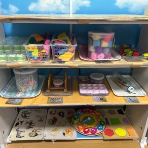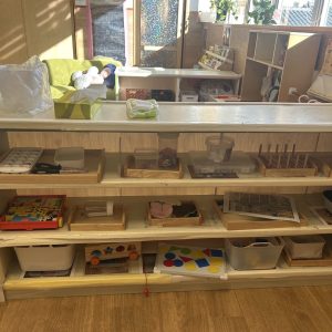 机のすぐ近くに机上遊び用の玩具を置いています。また、トレーに乗せることで運びやすく、片付けやすいように工夫しています。子どもたちの発達や興味に合わせて玩具を入れ替え、棚にぴったり収まる量を意識しています。